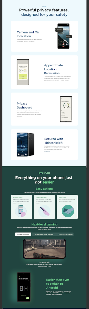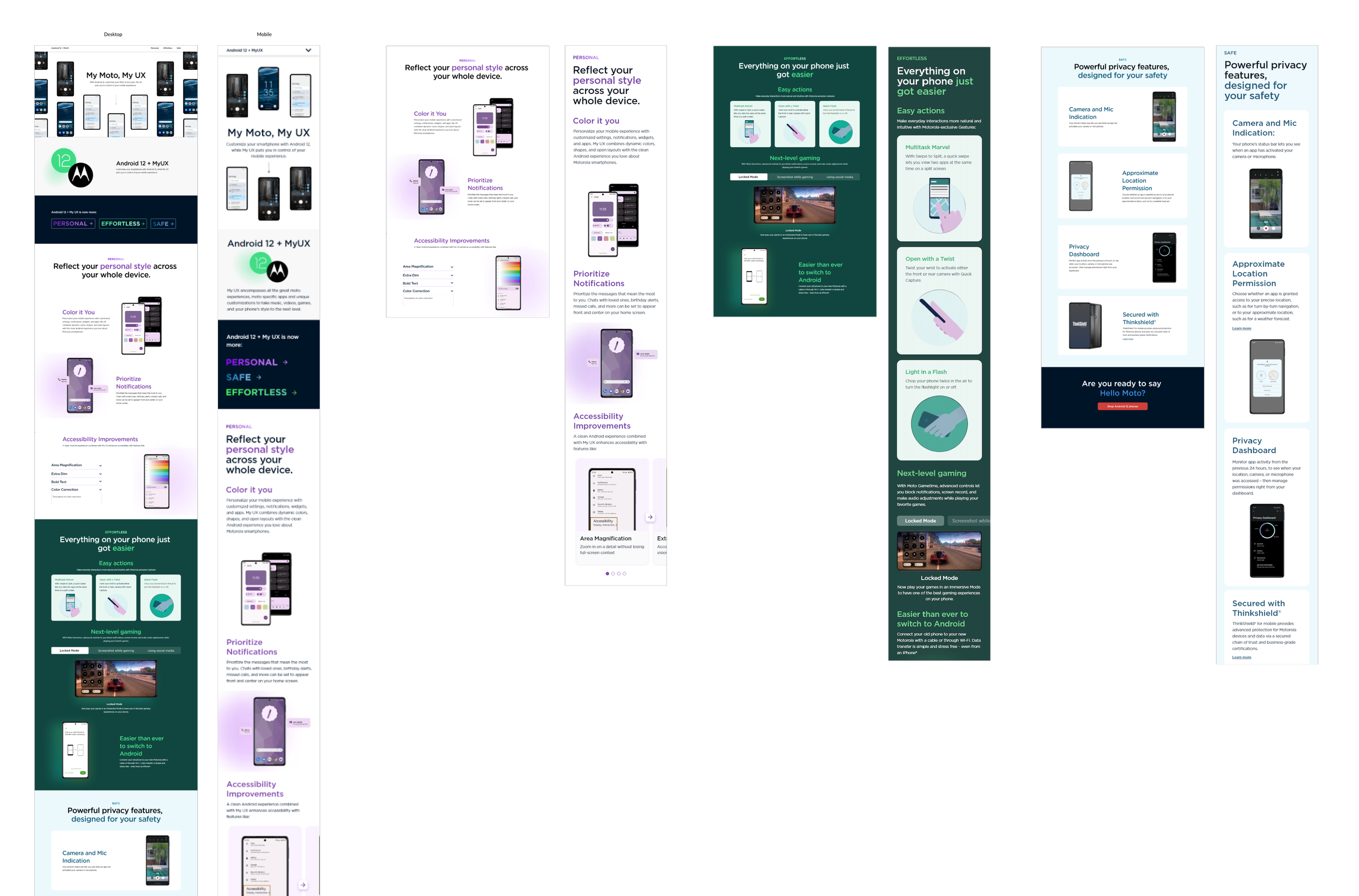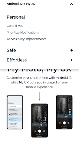 Motorola's smartphones are renowned for their integration of stock Android, providing users with extensive customisation options through Moto's ‘My UX’ interface. To fully leverage the Android 12 experience, we recognised the necessity of creating a dedicated page to showcase the vast possibilities offered by My UX, complemented by Android 12.