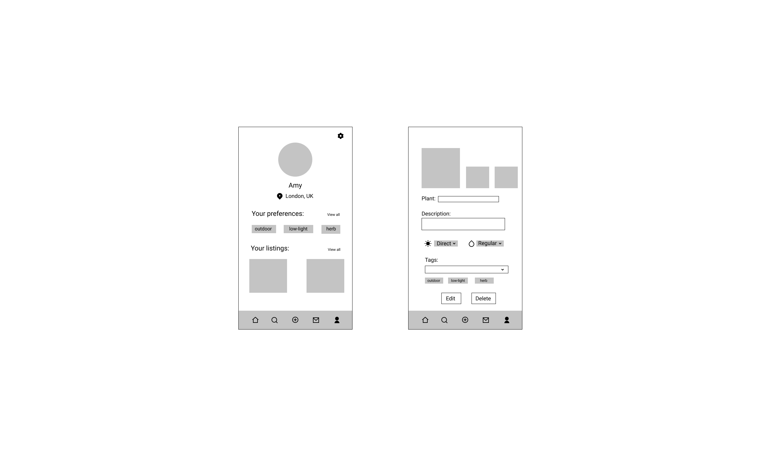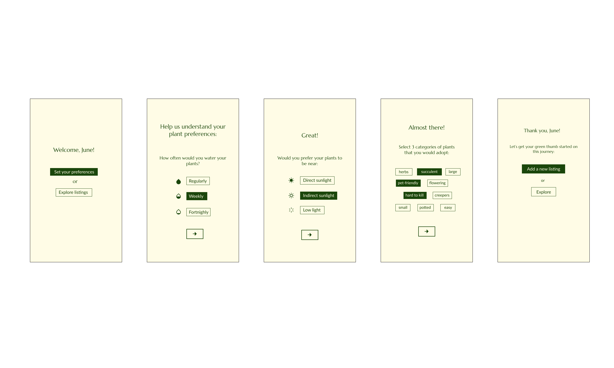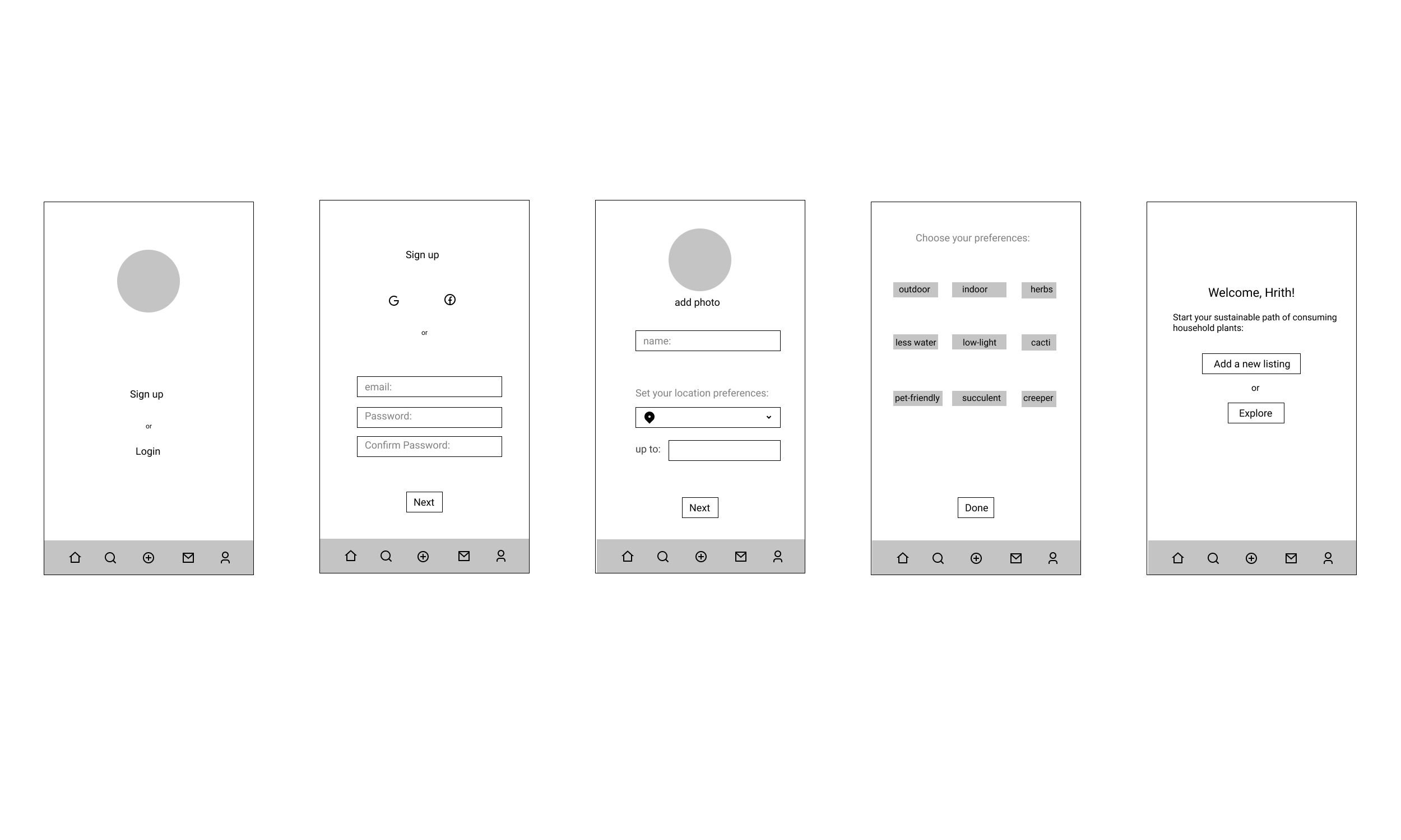 From the mind-map above, I worked on LeafLink as an app that allows users to “adopt” plants from plant owners. Below are the wireframes, where I explored potential user journeys as I sketched: